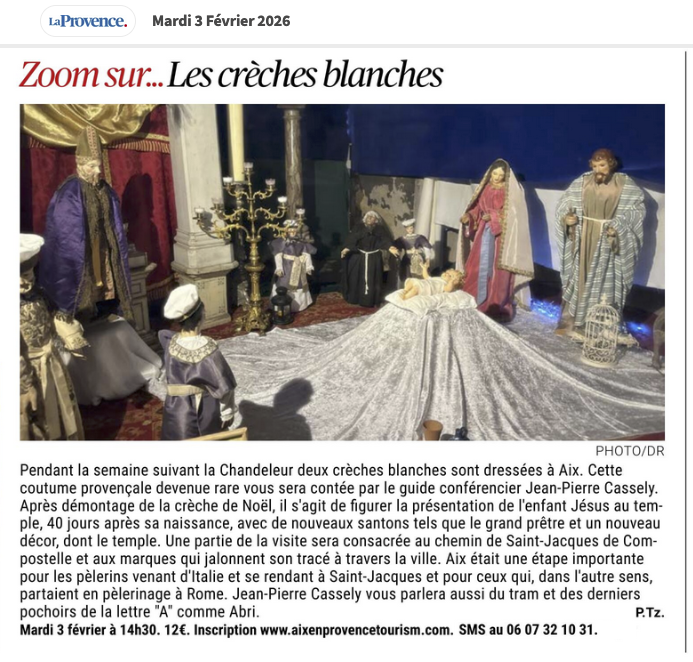 Oui, car vous ne le savez peut-être pas, Aix fut une étape importante du chemin de Saint-Jacques. En effet, les Italiens ou les habitants du Sud-Est de la France qui partaient pour Compostelle passaient obligatoirement par Aix pour rejoindre le chemin "officiel" à Arles. Et ils y repassaient au retour quand ils n'avaient pas laissé leur peau sur le chemin ou dans les auberges où rodaient les détrousseurs. NOUVELLE VISITE GUIDÉE