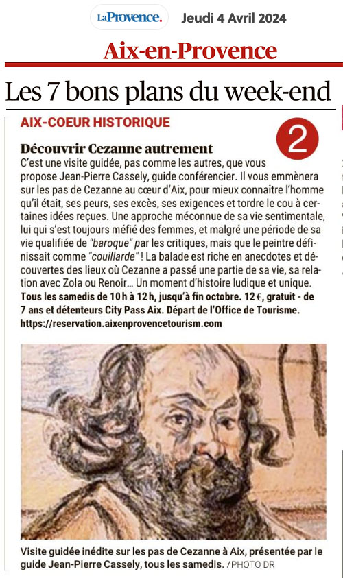Vous pourrez le matin parcourir Aix sur les traces du maître et, l'après-midi, visiter le site de Valcros-Bellevue d'où Cézanne a peint 52 toiles. ATTENTION : il ne s'agit pas de la visite traditionnelle "Cézanne à Aix" mais d'une visite inédite. L'EXPRESS SEMAINE DU 13 AOÛT 2014 A DES DATES PONCTUELLES (VOIR