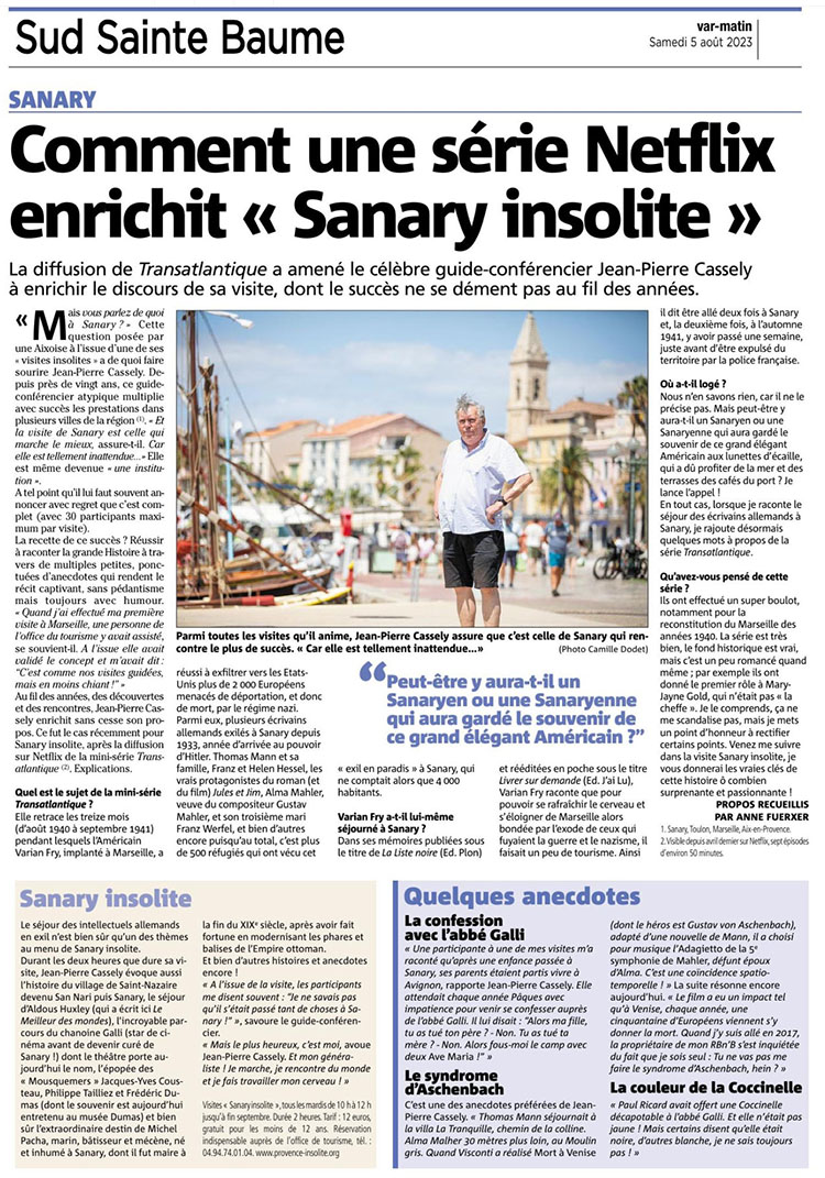 Visite guidée C’est à l’occasion de la sortie sur Netflix de la série « Transatlantique » à partir du 7 avril 2023 que nous vous proposons cette nouvelle visite guidée au centre de Marseille, sur les pas de Varian Fry. NOUVELLE VISITE GUIDÉE