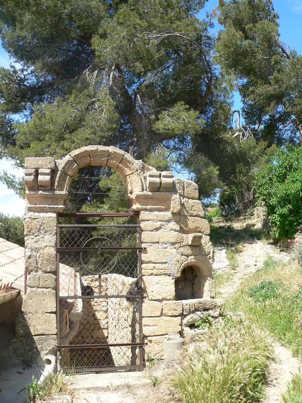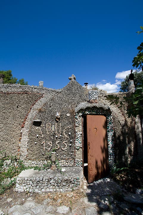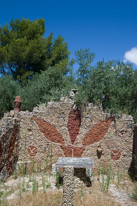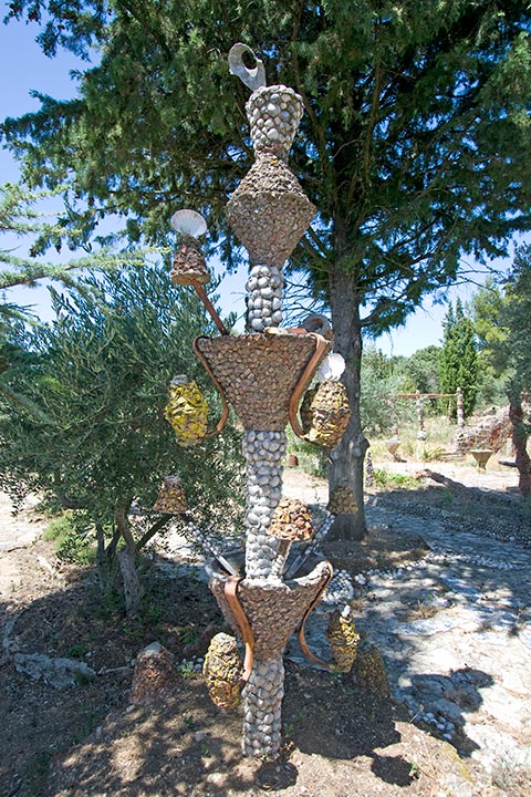 Les motifs ou sculptures du jardin sont en ciment décoré de tessons de poterie ou de céramique rappelant le style inimitable des “inspirés des bords de route” (selon le titre d’un livre de Jacques Lacarrière). On pense évidemment au Facteur Cheval et à la maison “de celle qui peint” (Pont de l'Etoile près d'Aubagne). Plusieurs “bâtiments” scandent le jardin. D’abord le bâtiment central qu’il disait être sa maison (il habitait en fait ailleurs), une vieille borie qu’il avait “habillée” puis une tour au sommet de laquelle on monte par un escalier étroit et enfin un abri de chasse pour se mettre à l'affût. Au sol, des motifs en coquilles Saint-Jacques, coquillage qui revient souvent dans le jardin. Malheureusement, le jardin ne se regarde que de l’extérieur car il est fermé par des portails et est relié à une alarme.