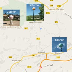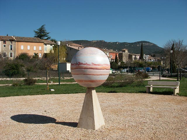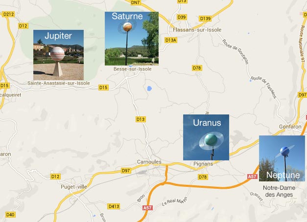 Ferrages à Sainte-Anastasie-sur-Issole Cette visite nous permettra d’arpenter ce « sentier des planètes » et d’admirer ensemble trois d’entre elles déjà en place à savoir Jupiter à Sainte-Anastasie-sur-Issole, Uranus à Pignans et Neptune à Notre-Dame-des-Anges. Pour ceux qui le désirent, ils pourront conclure la visite en se rendant à Besse-sur-Issole pour voir Saturne et le clocher copernicien du beffroi copie de celui de Pignans. Le projet en cours de réalisation consiste à représenter notre système solaire en trois dimensions et à l’échelle, tant pour la taille des planètes et du Soleil, que pour les distances les séparant. L’échelle choisie (1/140 000 000e) a été calée sur un Soleil mesurant 10 mètres. De ce fait, la distance entre le Soleil et Pluton est celle d’un Marathon : 42 km. La taille des planètes à l'échelle descend à quelques centimètres seulement pour les plus petites planètes (3,5 cm pour Mercure et 8,6 cm pour Venus). L’idée est de permettre au public d’appréhender l’immensité du système solaire par des trajets en voiture ou par des balades à pied car les implantations ont été conçues en tenant compte des sentiers existants. Des panneaux explicatifs le long du sentier apporteront les données scientifiques sur chaque astre. Le Soleil sera visible d’une grande partie du circuit. Plus d’infos sur le