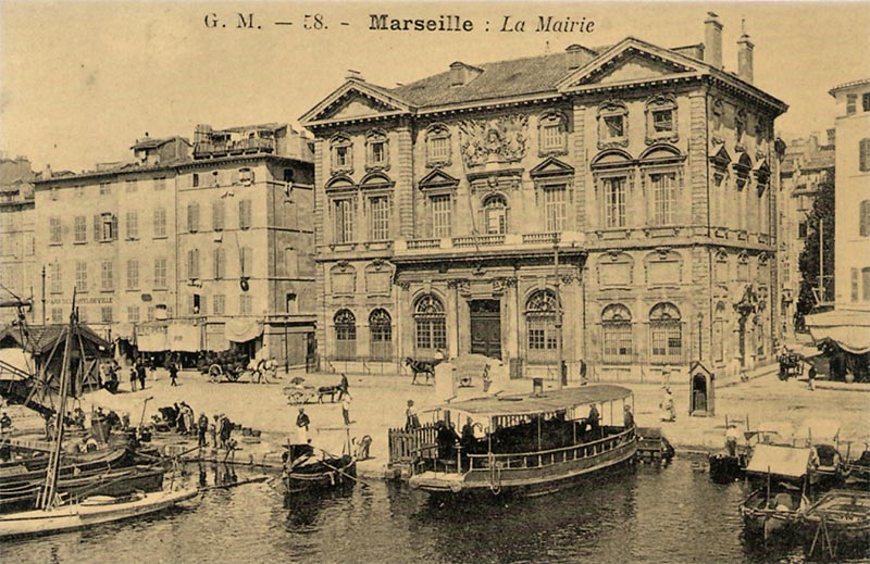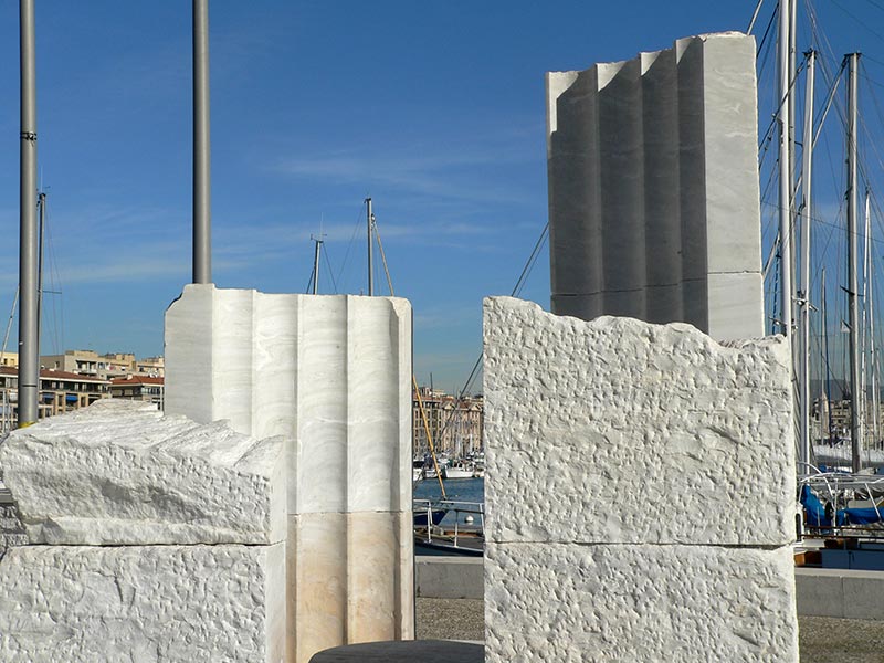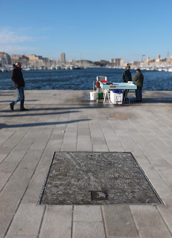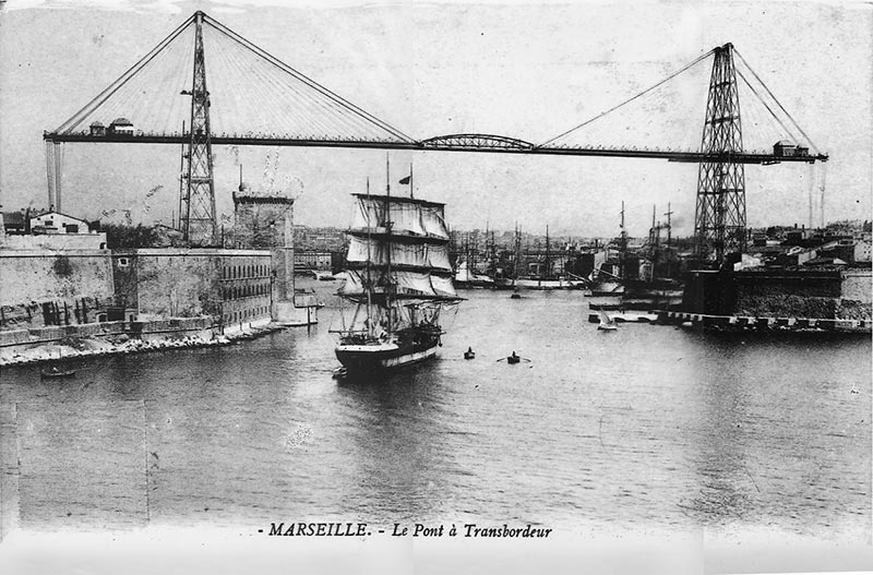 Et pour ceux qui voudront bien faire encore quelques pas, nous irons au bout du quai de Rive-Neuve au quai Marcel Pagnol (et oui ! on a quand même donné son nom à deux lieux à Marseille, l'autre étant l'allée Marcel Pagnol dans le 8e ardt.). Quel Marseillais sait où se trouve ce quai ? On pourrait penser trouver là un monument à la gloire de cet immense créateur ! he bien non ! c'est un monument dédié aux fondateurs phocéens de la cité offert par la Grèce et composé de quatre blocs (40 tonnes) rappelant les crénelures de colonnes de temples en marbre du Pentélique. Sans doute a-t-on donné le nom de l'auteur emblématique à cause de l'ancien pont transbordeur qui partait de ce quai pour traverser le Vieux-Port. C'est d'ailleurs la première image du film "Marius" ce même transbordeur abattu par l'occupant en 1944. Alors en hommage respectueux, nous sortirons un jeu de cartes et nous entamerons une partie de Manille sur la table de marbre du monument de Gyptis et protis !