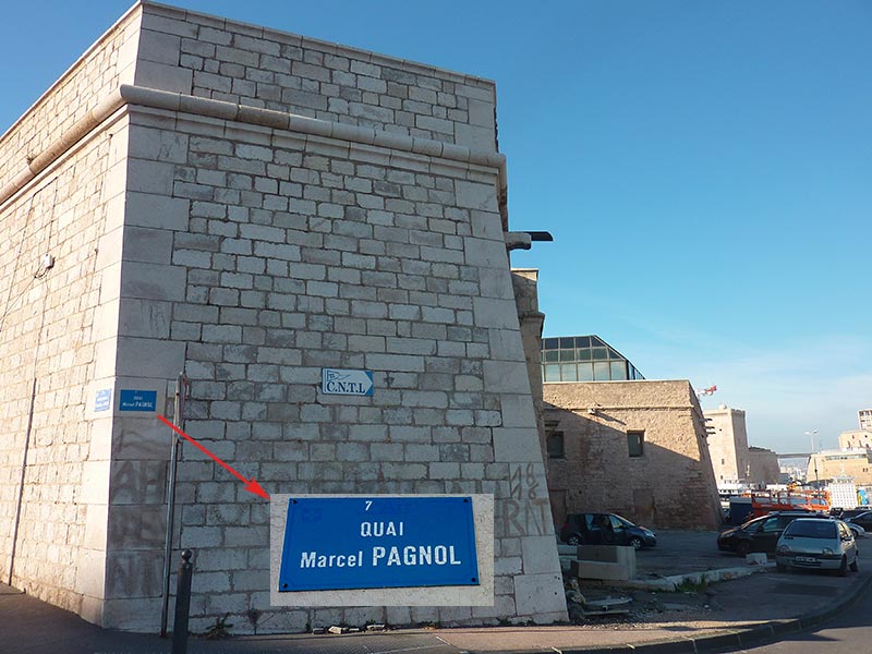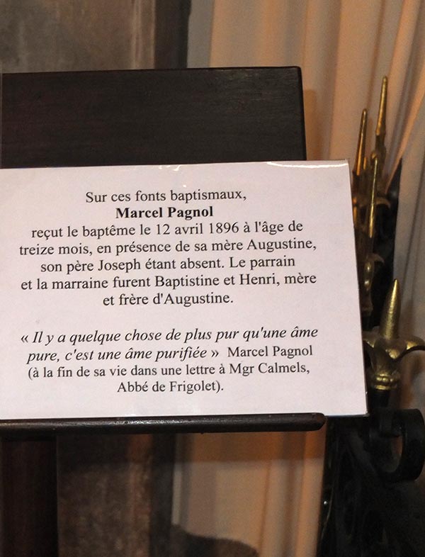 A l'entrée du Palais de la Bourse nous ne manquerons pas de faire une halte devant une Turcat-Mery de 1927, voiture construite à Marseille et qui fut la première automobile achetée par l'immense acteur qu'était Jules Raimu, créateur du rôle de César alors que Marcel Pagnol voulait lui faire endosser celui de Panisse. Nos pas nous mèneront alors vers l'église Saint-Charles dont les fonds baptismaux ont accueilli un candidat que l'on pourrait qualifier de clandestin : le petit Marcel Pagnol baptisé par sa mère en cachette de Joseph le père instituteur anticlérical intransigeant ! Le fait y est rappelé par un écriteau placé à côté de la cuve baptismale.