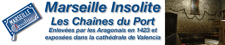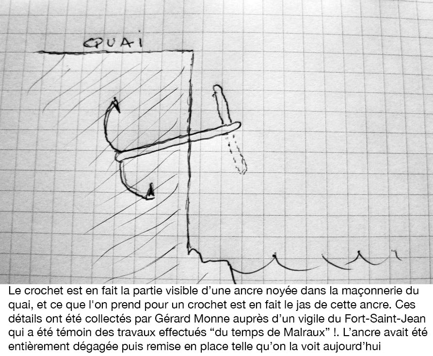 Le 26 novembre 1423, Marseille, ou ce qu’il en restait, comptait ses morts et faisait le bilan du pillage perpétré par les Aragonais-Catalans. Ces derniers qui venaient de se prendre une raclée devant Naples rentraient chez eux la queue basse quand, voguant devant Marseille désertée par ses marins et soldats justement partis vers les eaux italiennes participer au combat, ils décident de se venger sur la ville sans défense. Ils débarquent secrètement aux Catalans (une autre hypothèse existe pour l’origine du nom) et mettent la ville à sac, à feu et à sang pendant deux jours. Les Aixois venus en renfort arriveront trop tard (merci quand même - il y a un tableau dans la salle des Etats de Provence à Aix qui rappele cet épisode et le comique de situation causé par le fait que le drapeau aixois était identique à celui des Catalans). Outre les archives de la ville, les objets précieux civils et religieux, l’or et la monnaie et les réserves alimentaires, les pillards ont emporté avec eux et déposé dans la cathédrale de Valence (Valencia) les reliques de saint Louis d’Anjou et les chaînes qui barraient l’entrée du port de Marseille. Ces chaines que l’on peut voir encore aujourd’hui narguer le touriste marseillais sur les murs de la chapelle du Saint-Sépulcre. Récemment un auditeur de France Bleu m’a envoyé une photo de ce qui semble être le crochet d’attache des chaines, encore visible aujourd’hui. Puis nous irons à l’église Saint-Férréol voir le reliquaire de Saint-Louis d’Anjou (vide car les vertèbres que nous avait "offert" l'évêque de Valencia ont été volées). Un détail supplémentaire fourni par cet auditeur : "il y a peu de temps, me promenant jusqu'au coin du Fort St Jean pour constater que le crochet y était toujours; un surveillant près de l'Algeco m'interpelle! Après lui avoir expliqué le but de ma curiosité, il me répond d'emblée "Bien sûr c'était le crochet qui retenait la chaîne" (Réponse moult fois entendue sans preuve) et il rajoute: C'est une ancre entière, la Sarde, noyée dans la maçonnerie du quai, la partie visible que l'on prend pour un crochet est en fait le jas de cette ancre. Voir croquis plus bas. Je lui demande comment il sait cela? Il me dit qu'il a assisté à des travaux de restauration de ce bout de quai à l'époque de Malraux, et que l'ancre était apparue en son entier. Avant que tout soit remis en place dans l'état actuel. Je ne sais pas quel crédit accorder aux dires de cette personne qui ne semble pas être, à première vue, un spécialiste? Mais... l'habit ne fait pas le moine. Nous ne lancerons pas une pétition pour que les Valenciens nous rendent les chaines car nous pensons qu’il y a d’autres sujets plus importants qui mériteraient une pétition mais nous rédigerons un message à l’attention de leur mairesse qui a moyennement apprécié la phrase de Jean-Claude Gaudin quand Valence a remporté l’America’s Cup à nos dépends : « nous demanderons à Madame le Maire de Valence de bien vouloir nous rendre nos chaines ». À quoi elle aurait répondu : « avec plaisir quand l’Etat français nous aura rendu tout ce que Napoléon-Bonaparte nous a volé … » Les chaines du Port de Marseille enlevées